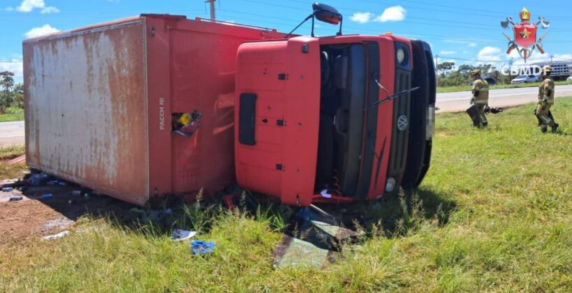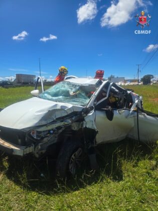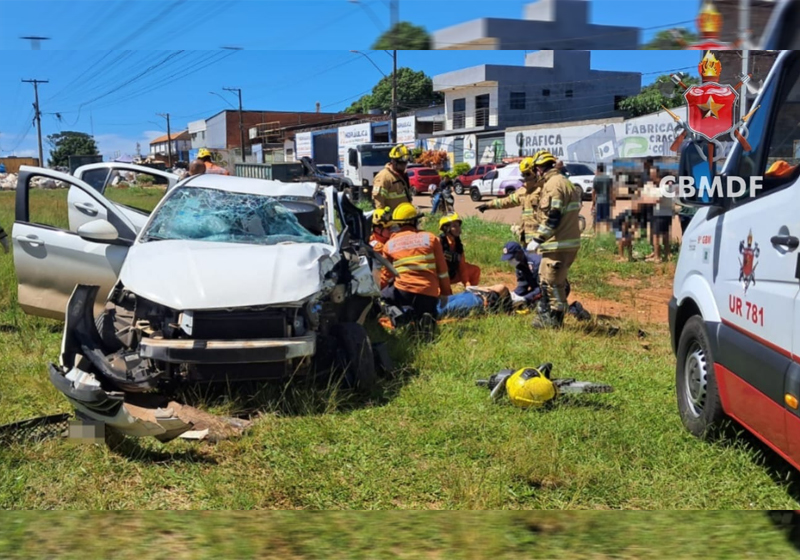 O Corpo de Bombeiros Militar do Distrito Federal (CBMDF) foi acionado às 10h08 para atendimento da ocorrência, com o empenho de duas viaturas de resgate. No local, as equipes encontraram uma colisão envolvendo uma motocicleta Honda, de cor azul; um Fiat Cronos, de cor branca, que capotou; e um caminhão baú, de cor vermelha, que também capotou.