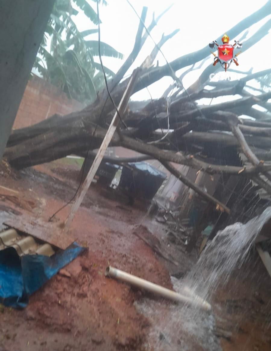 No local, as equipes encontraram a casa com parte do telhado comprometido pela árvore caída. Os militares realizaram o gerenciamento de riscos, isolaram a área e iniciaram o corte da estrutura para evitar danos maiores.
