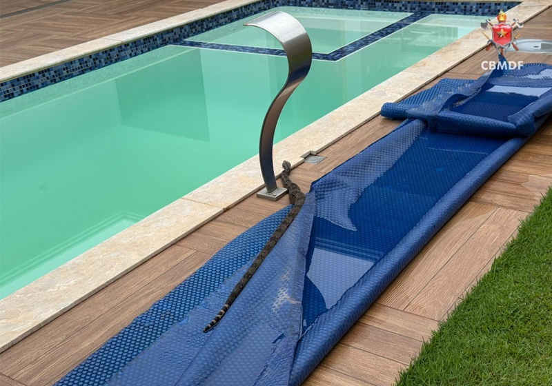 A ocorrência foi registrada às 15h34 e contou com o empenho de uma viatura. Segundo os bombeiros, o animal foi encontrado na área de lazer da residência, nas proximidades da piscina, o que representava risco potencial aos moradores.