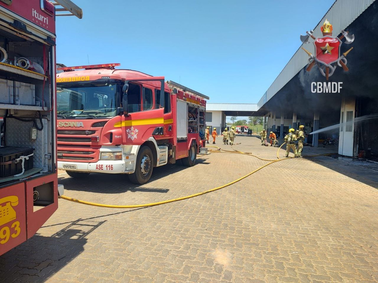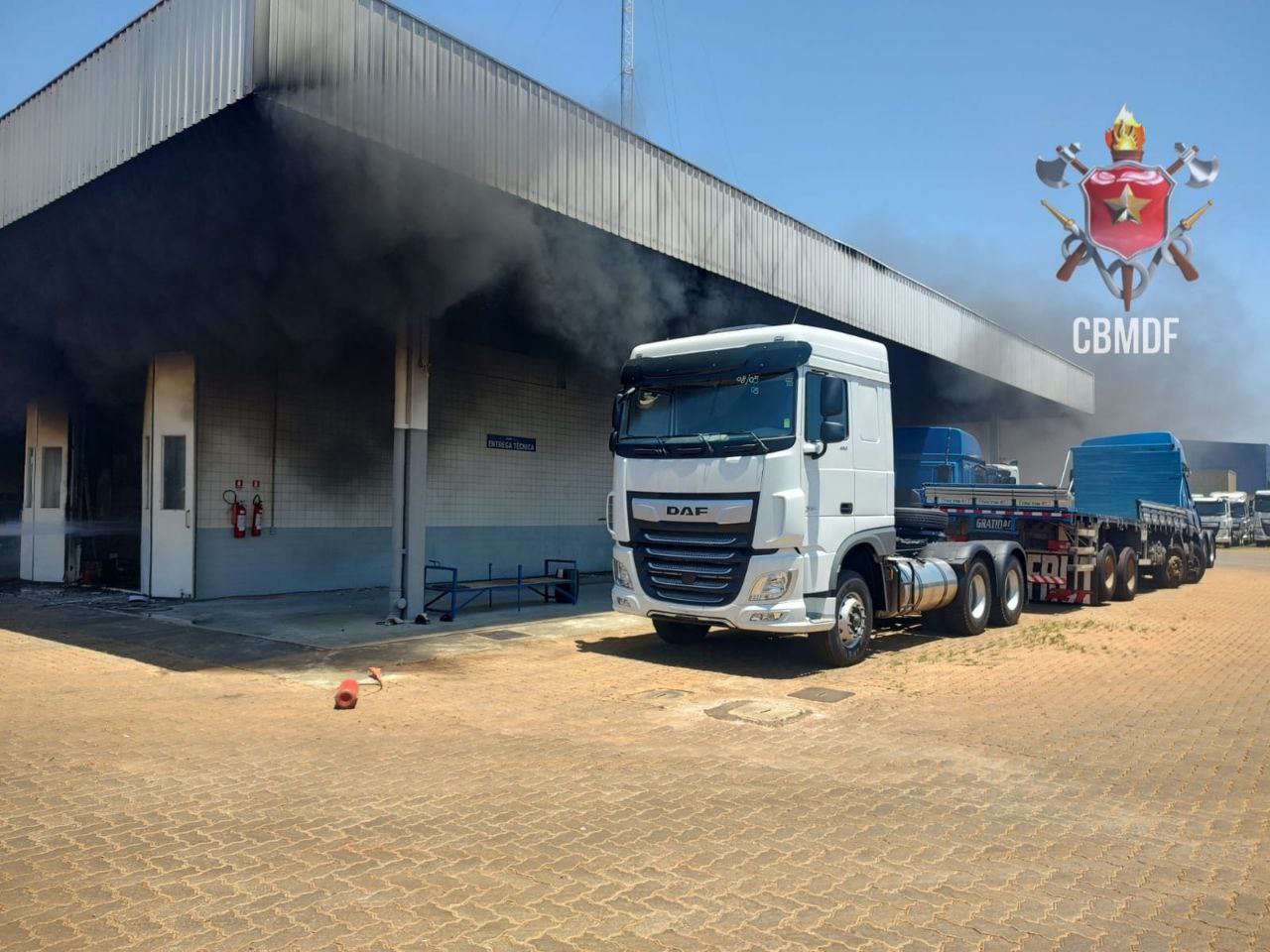 O incêndio ocorreu nesta manhã de quarta (15) no Galpão da Concessionária de Caminhões DAF, às margens da BR 040 no Polo de desenvolvimento JK, Trecho 1, conjunto 4.