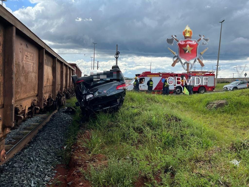 Carro de passeio é atingindo por trem em passagem de nível no Guará II