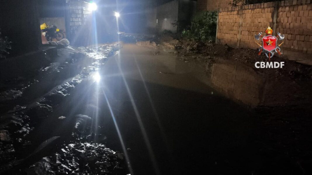 O Corpo de Bombeiros Militar do Distrito Federal (CBMDF) foi acionado às 19h18 para atender a ocorrência. Ao chegar ao local, as equipes encontraram uma rua totalmente alagada, com o nível da água chegando à cintura de uma pessoa adulta.
