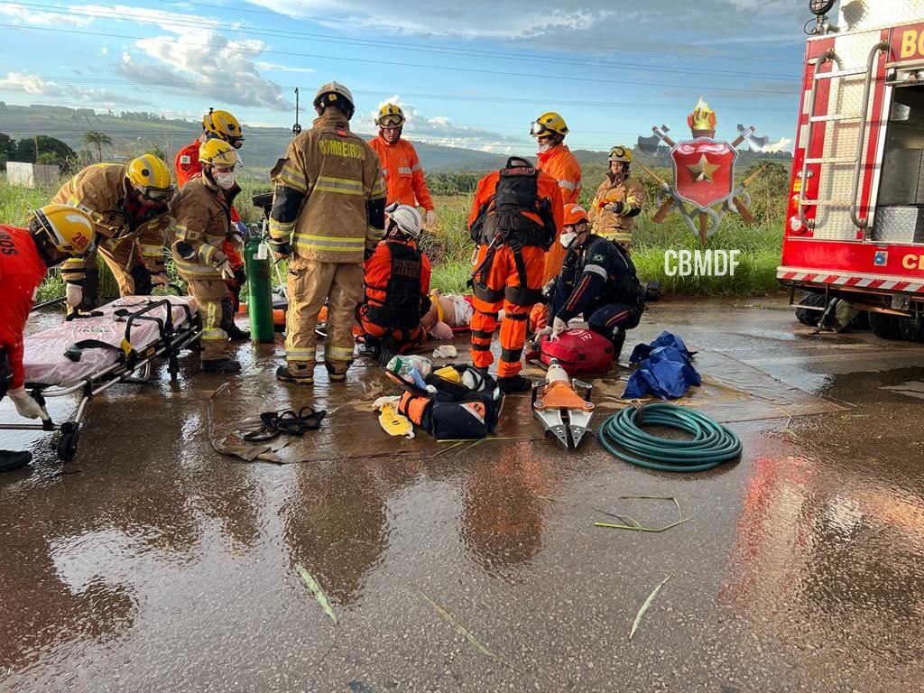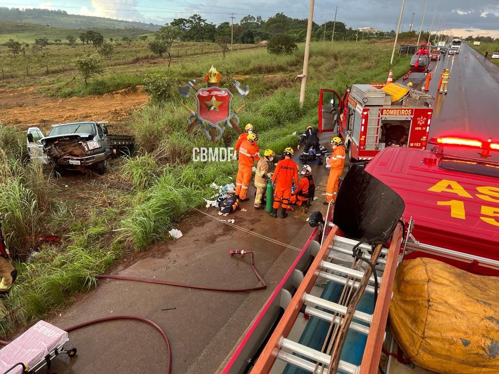 Neste sabado, o Corpo de Bombeiros Militar do Distrito Federal (CBMDF) atendeu a um acidente de trânsito às 16h29 e quando as equipes de socorro chegaram ao local, encontraram dois veículos fora da pista em sua margem à direita, ambos apresentando grande avaria em suas partes dianteiras, sugerindo a hipótese de uma colisão frontal.
