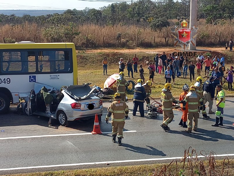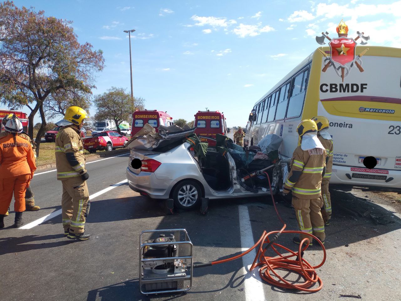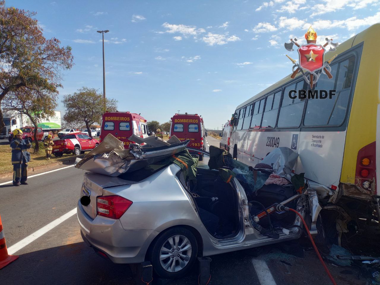 No local, a equipe do Corpo de Bombeiros Militar do Distrito Federal (CBMDF) se deparou com um Honda City, de cor prata, que havia acabado de colidir contra a traseira de um ônibus da Viação Pioneira, conduzido pelo senhor A. R. Q, idade não informada, que não se feriu no acidente.