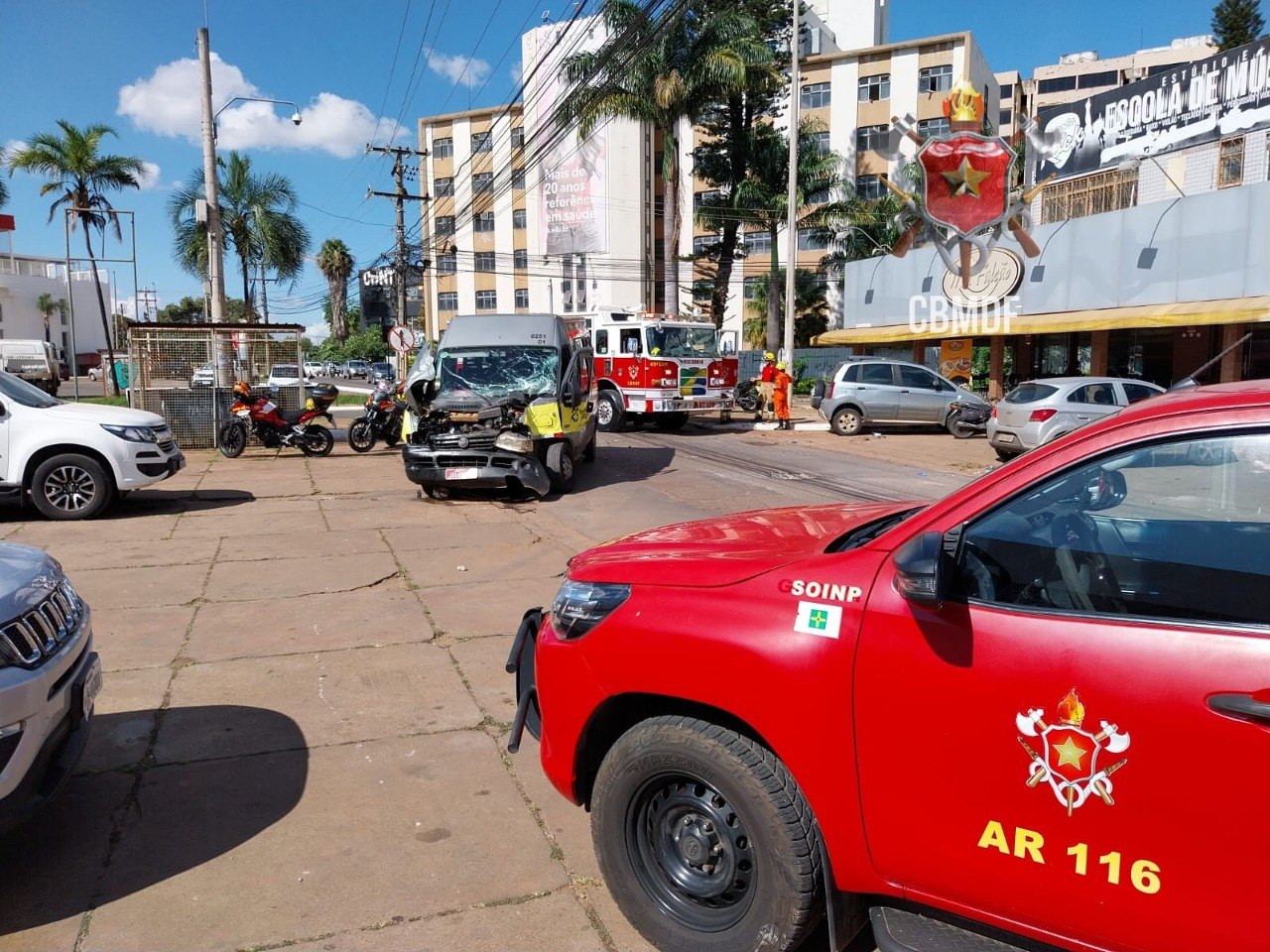 Nesta sexta-feira (5), uma colisão entre um ônibus e uma van escolar deixou dois adolescentes feridos na CSA 01 lote 01, atrás do Posto de Combustíveis NENEN’S CHOPP