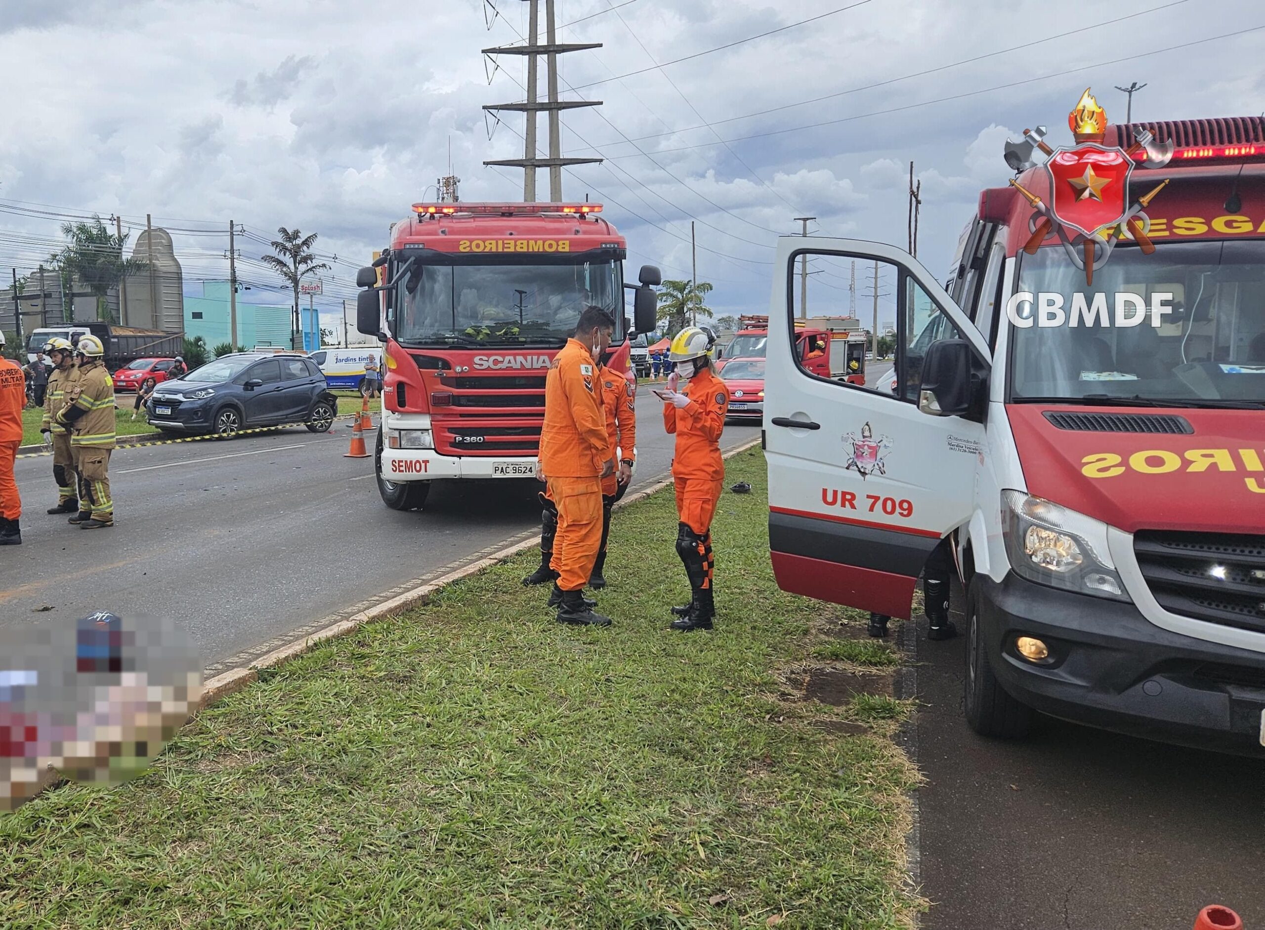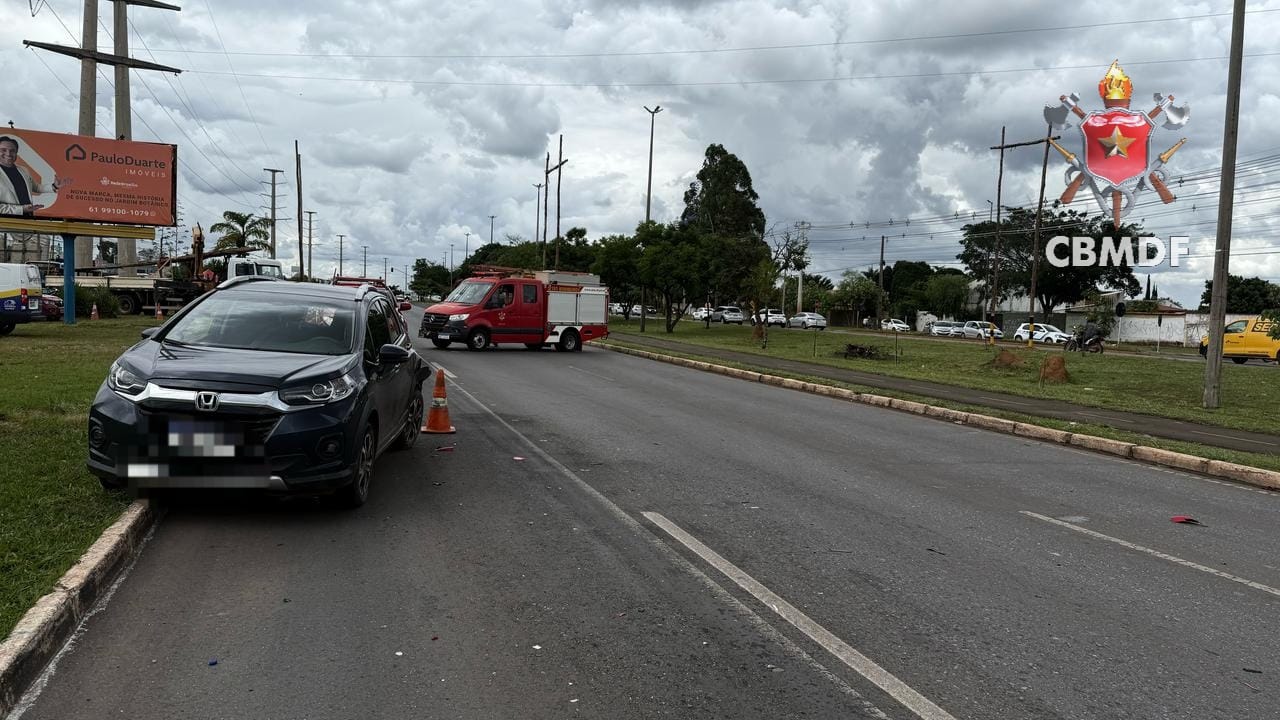 Na tarde desta terça-feira (25), O Corpo de Bombeiros Militar do Distrito Federal (CBMDF) atendeu uma ocorrência grave às 13h12 na via principal, em frente ao Condomínio San Diego, no Jardim Botânico, envolvendo três veículos: um Honda WR-V azul, uma motocicleta Honda CG Fan 160 vermelha e um Fiat Uno cinza.