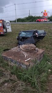 O Corpo de Bombeiros Militar do Distrito Federal (CBMDF) foi acionado às 15h47 e empenhou três viaturas para o atendimento da ocorrência. Ao chegarem ao local, as equipes encontraram um veículo Honda Civic, de cor preta, que havia colidido contra uma caixa de águas pluviais às margens da rodovia.