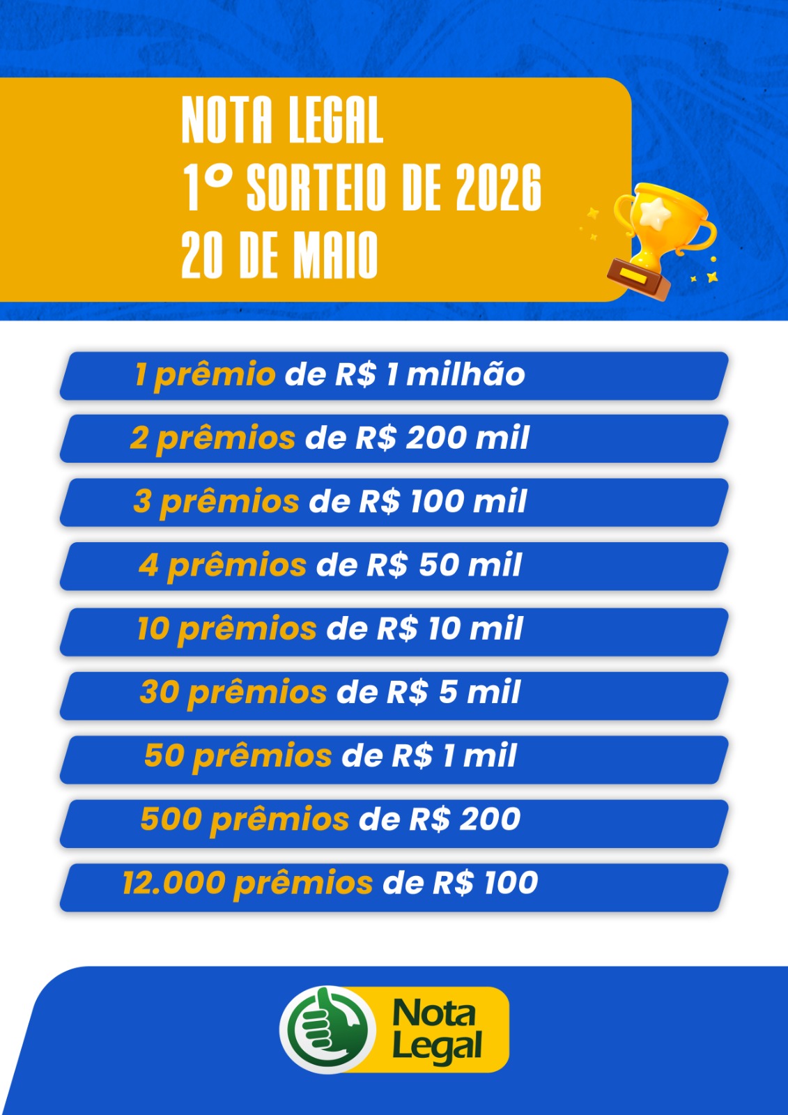 Os valores dos prêmios são integrais, descontado o imposto de renda incidente sobre o prêmio. A premiação terá como base os cinco primeiros números premiados do concurso da Loteria Federal a ser realizado no dia 16 de maio de 2026. O resultado será divulgado por meio da internet, no sítio do Programa Nota Legal, no site do programa Nota Legal.