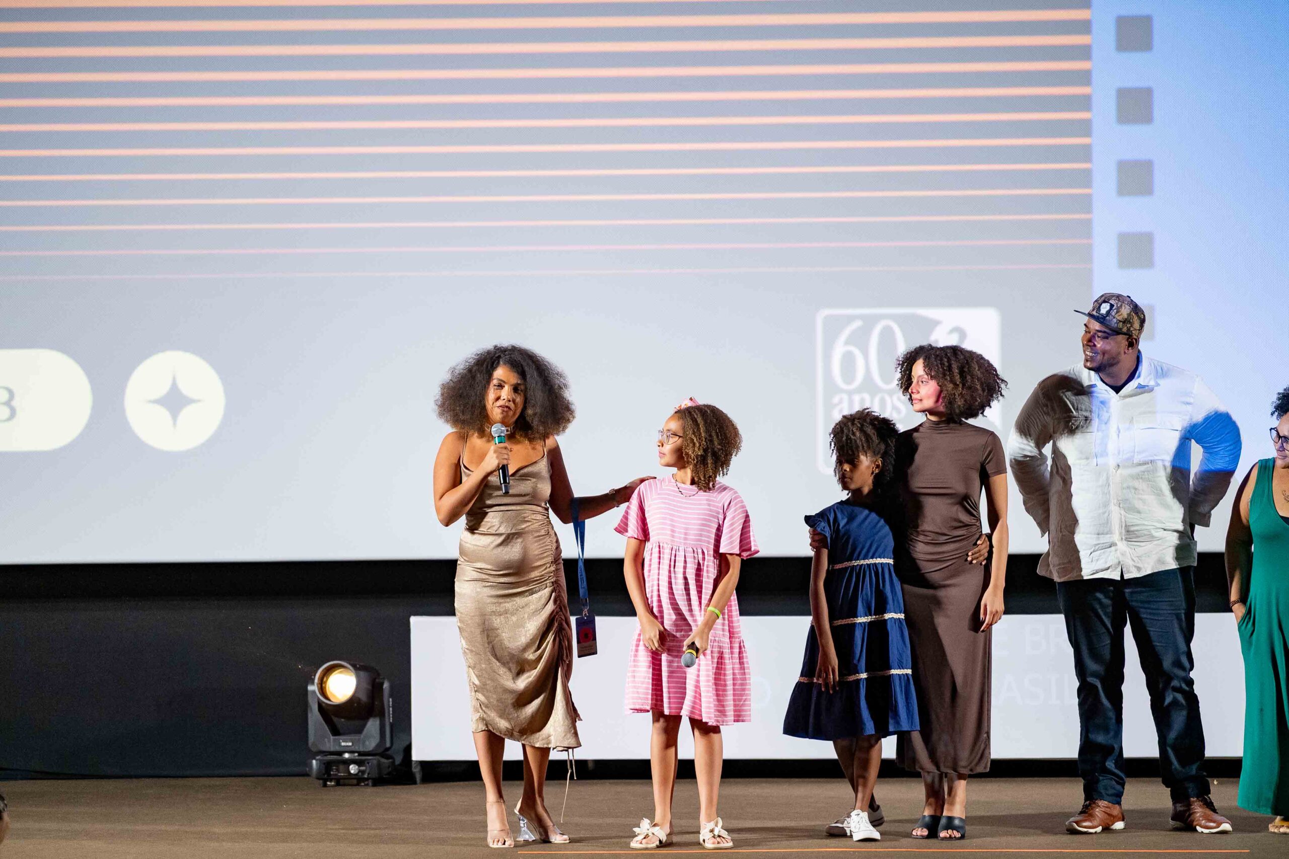 Equipe do filme O cheiro do seu cabelo, de Clara Maria Matos, durante apresentação no terceiro dia da Mostra Brasília. A exibição ocorre em 17 de setembro de 2025 no Cine Brasília.