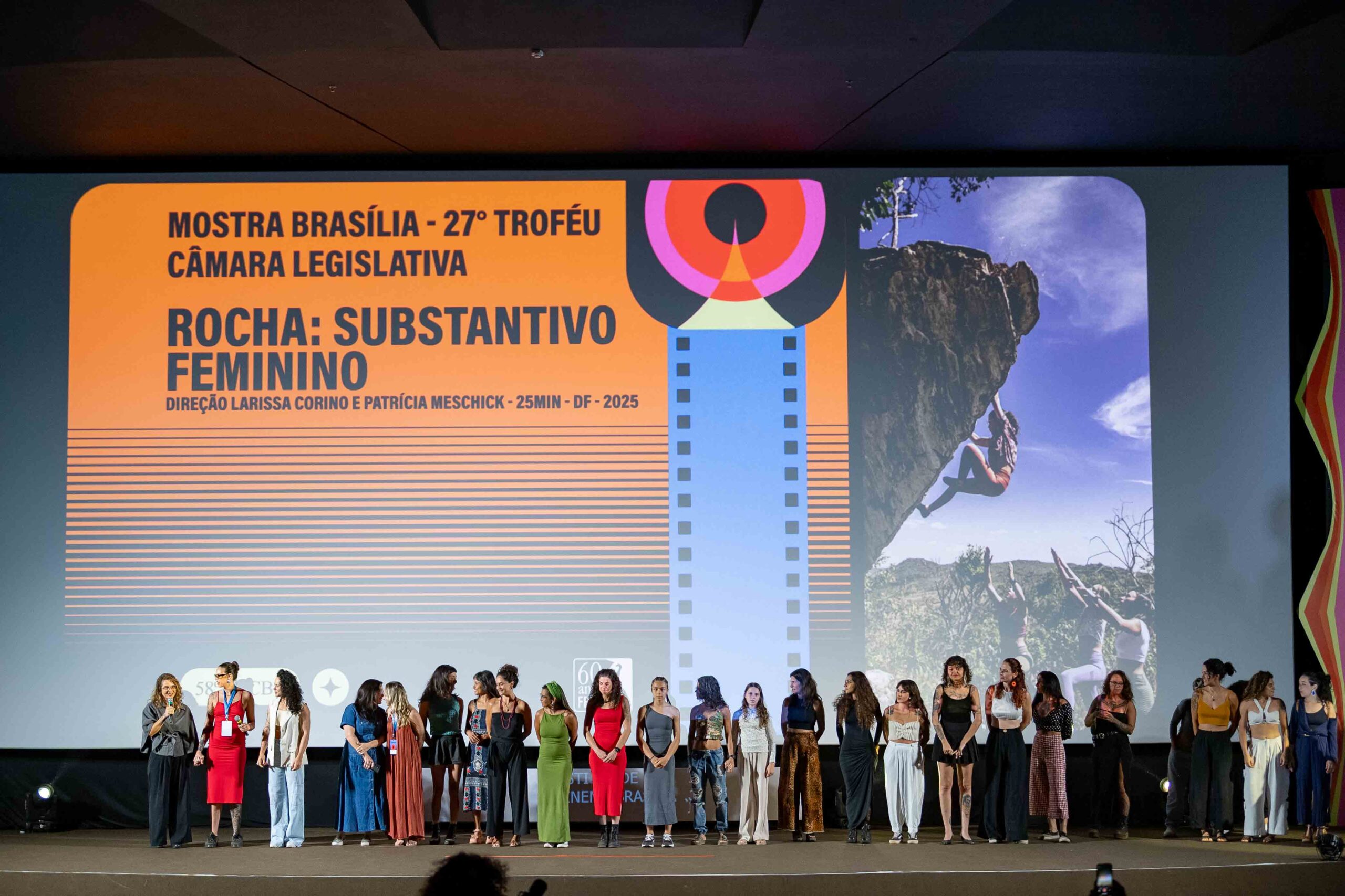 Equipe do filme Rocha: substantivo feminino, de Larissa Corino e Patrícia Meschick, durante apresentação no terceiro dia da Mostra Brasília. A exibição ocorre em 17 de setembro de 2025 no Cine Brasília.