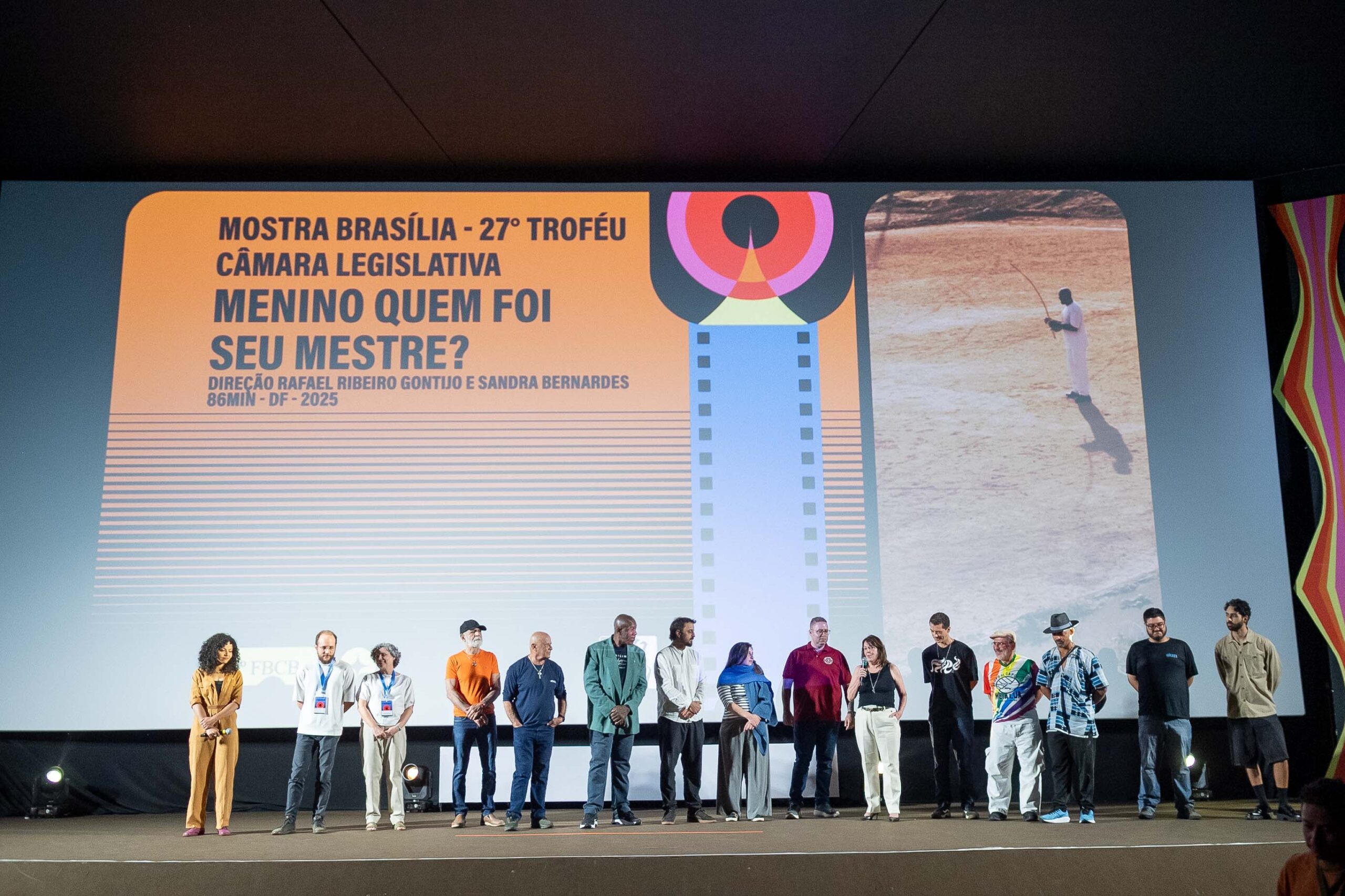 Equipe do filme Menino quem foi seu mestre?, de Rafael Ribeiro Gontijo e Sandra Bernardes, durante apresentação no terceiro dia da Mostra Brasília. A exibição ocorre em 17 de setembro de 2025 no Cine Brasília.