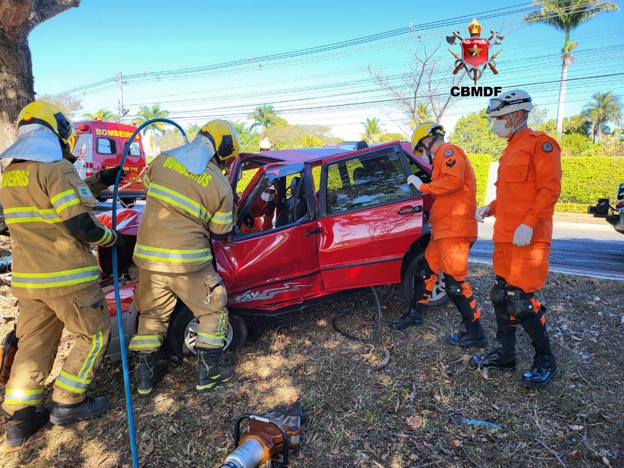 O mesmo estava com as pernas presas às ferragens sendo necessário que os militares usassem o aparelho desencarcerador para retirá-lo do veículo. O paciente foi atendido pelos socorristas que aplicaram o protocolo de trauma e constataram que estava consciente e orientado, apresentando uma suspeita de fratura na região do tronco, corte na face e escoriações pelo corpo. A vítima estava estável e foi transportada ao IHBDF.