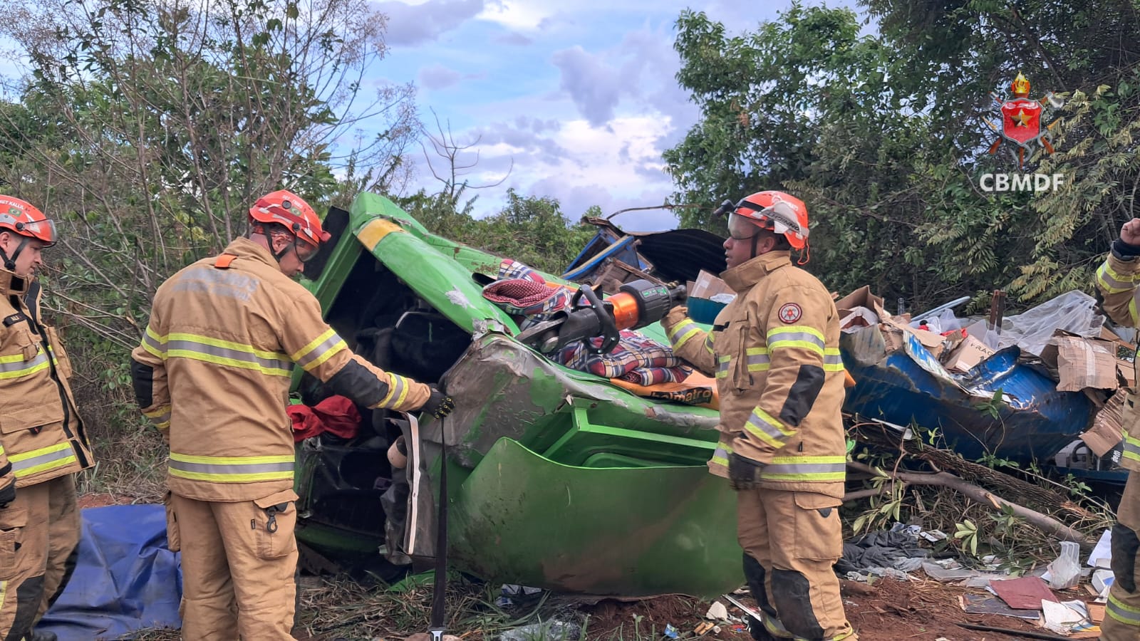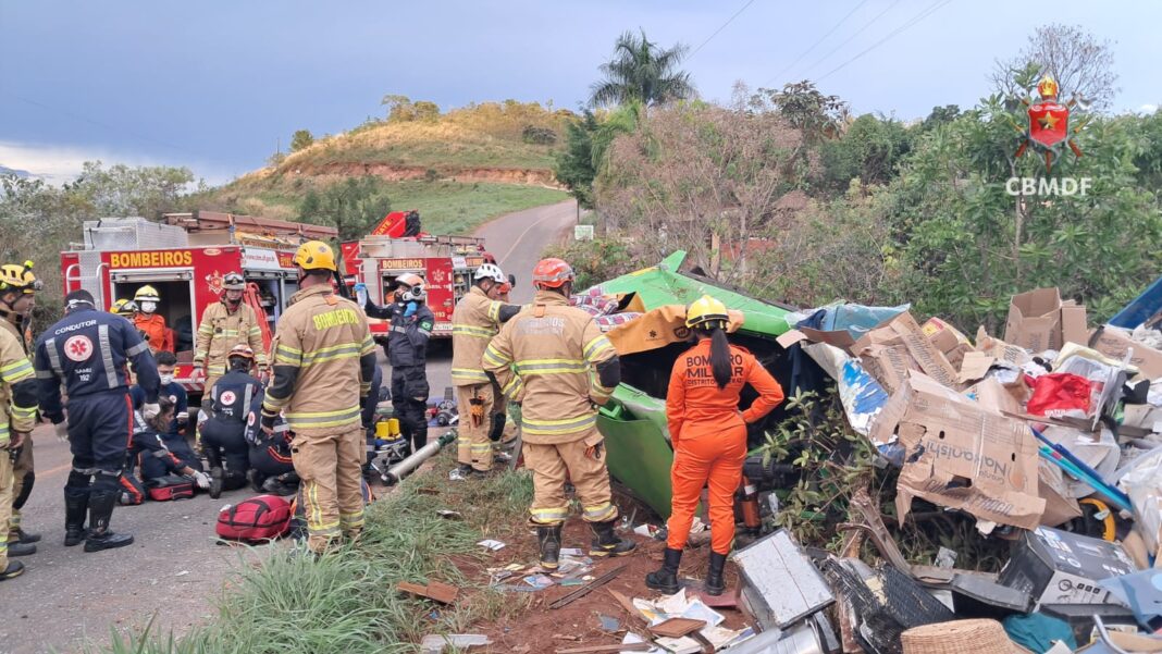 O Corpo de Bombeiros Militar do Distrito Federal (CBMDF) foi acionado às 17h08 e empregou quatro viaturas no atendimento. No local, os militares encontraram o veículo do tipo baú tombado às margens da via.