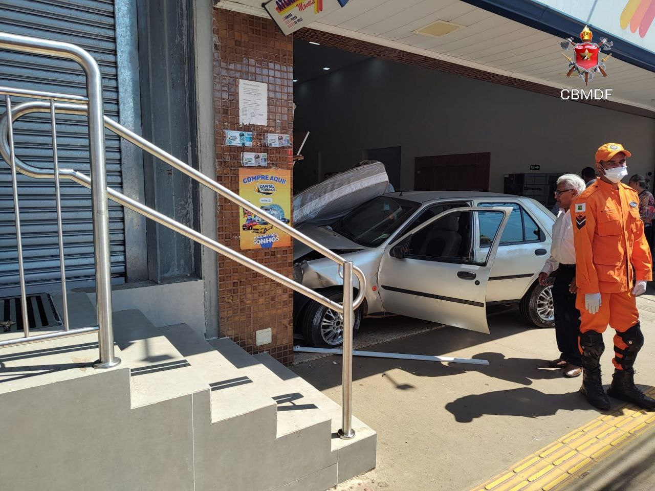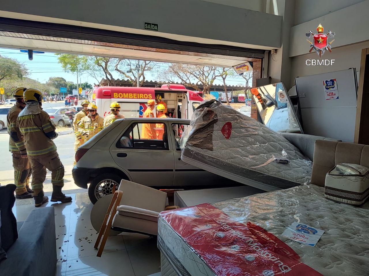 Nesta manhã de segundo, o Corpo de Bombeiros Militar do Distrito Federal (CBMDF) foi acionado às 11h09 para um acidente de trânsito na Avenida Independência, próximo a Rodoviária de Planaltina-DF. Chegando ao local as equipes se depararam com um FORD/Fiesta de cor prata, conduzido e ocupado somente pela senhora A.A.S., 32 anos, que após ter perdido o controle da direção, saiu da via e entrou em um loja de móveis atingindo o senhor W.N.S., 30 anos, funcionário da loja que no momento do acidente estava na frente do estabelecimento.