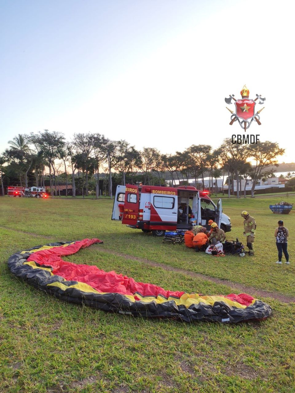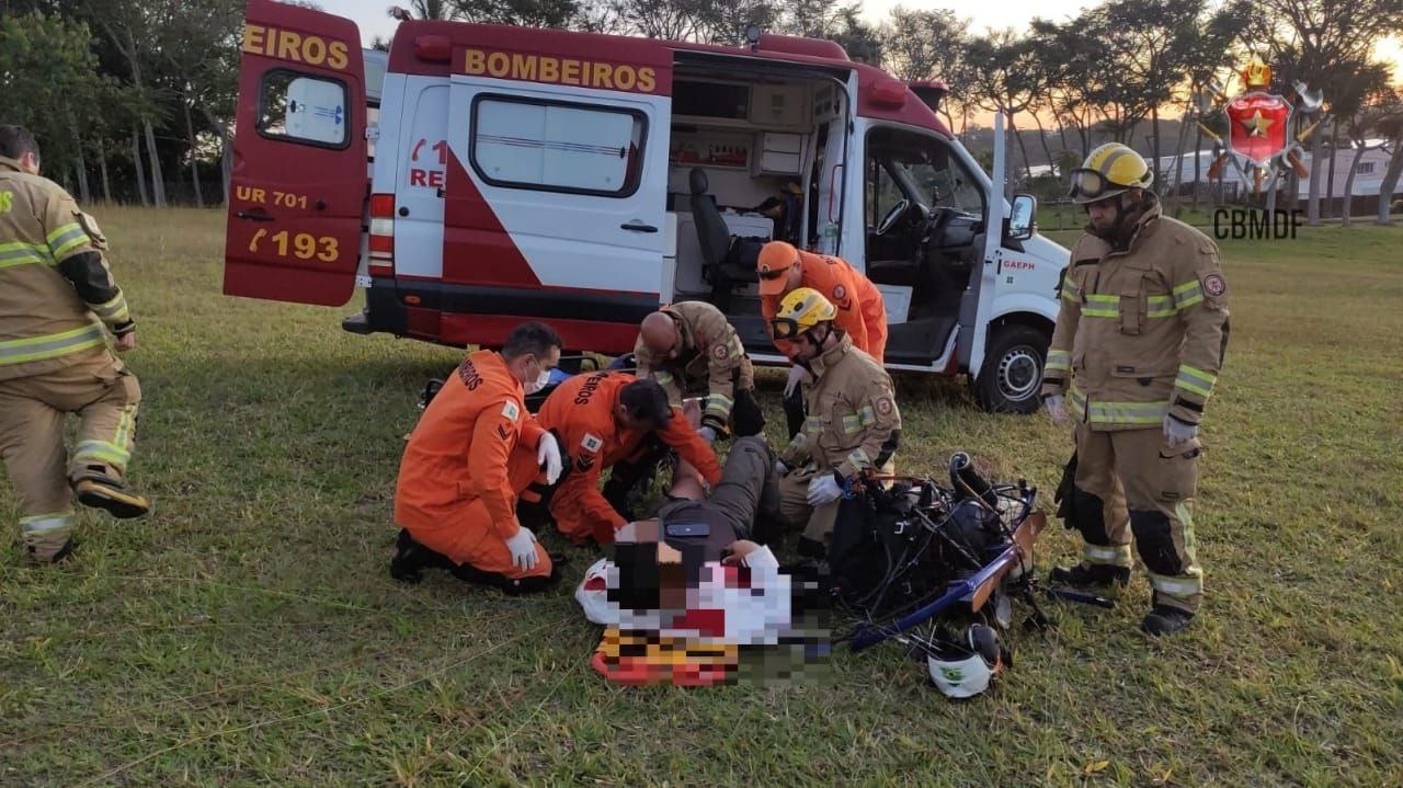 O CBMDF foi acionado através do 193 pelo sr. L. S. O. de 43 anos, piloto de paramotor, para socorrê-lo de uma queda. O fato aconteceu neste domingo 21/05 às 17h23