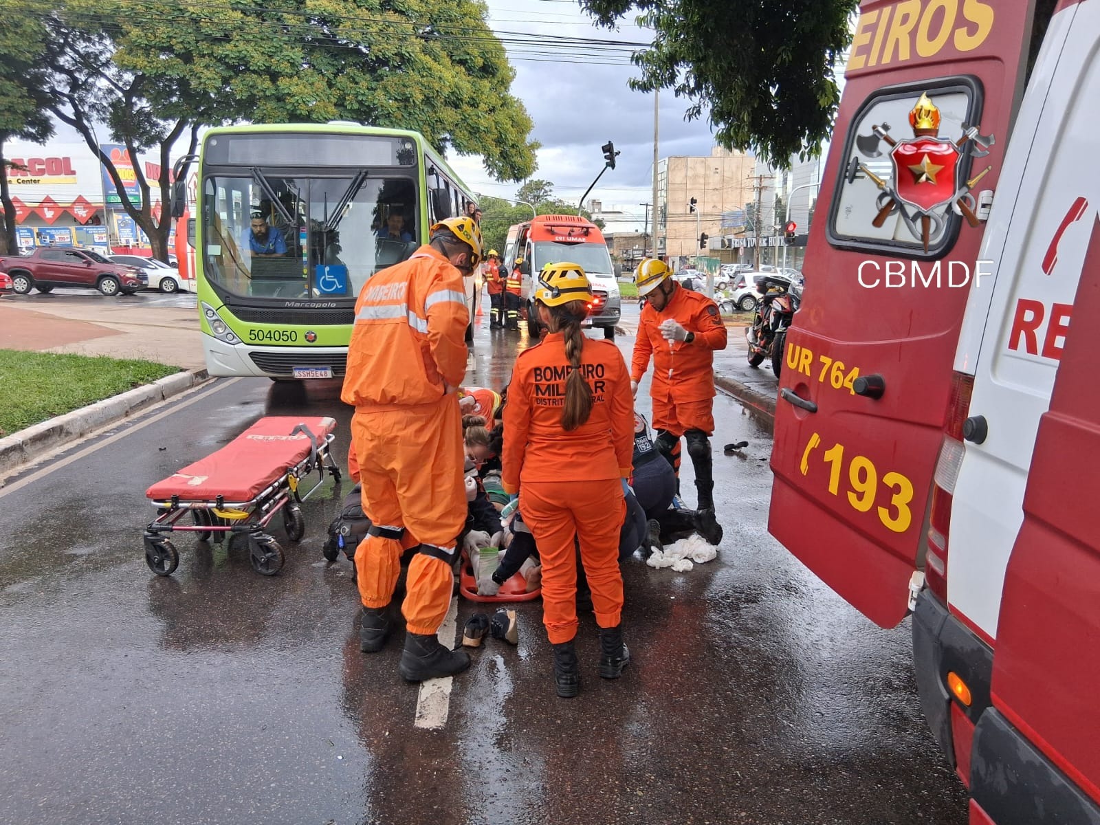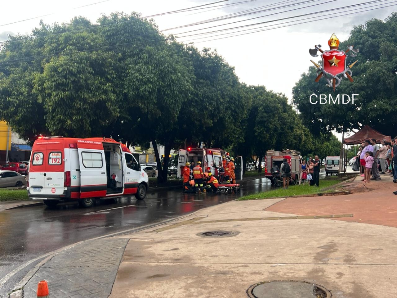 O acidente aconteceu na via CNN 01, em frente à loja Demacol. Ao chegarem ao local, os bombeiros encontraram duas vítimas caídas ao solo: o condutor da motocicleta e um pedestre que atravessava a via no momento do impacto.