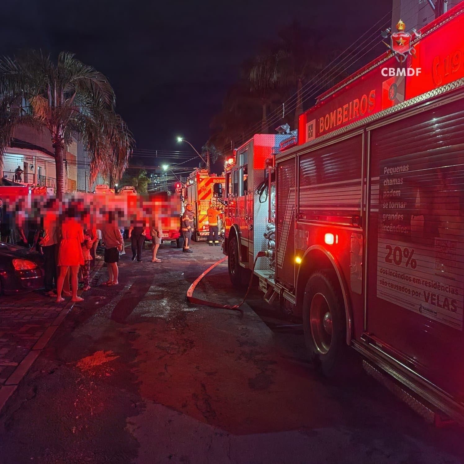 A corporação foi acionada às 20h32 e deslocou 13 viaturas até o endereço, localizado na QS 05, Rua 100. Ao chegarem ao local, as equipes encontraram chamas intensas saindo pelas janelas do imóvel, além de grande quantidade de fumaça, o que exigiu resposta rápida para evitar a propagação do fogo.