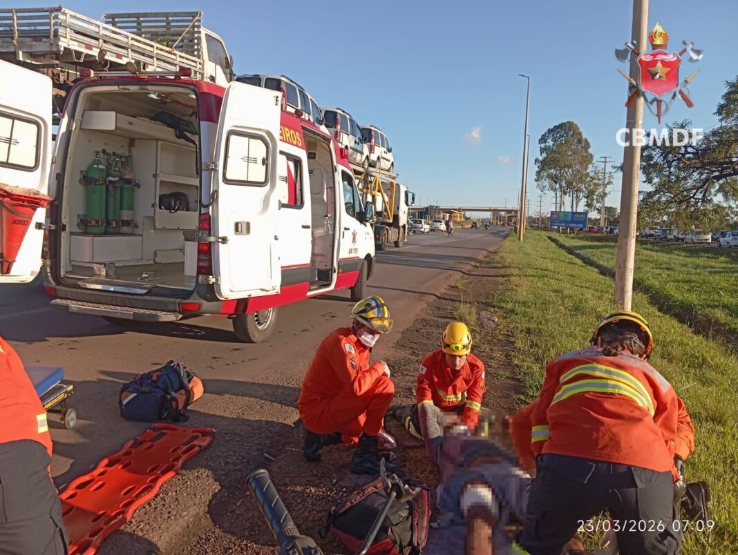 O Corpo de Bombeiros Militar do Distrito Federal (CBMDF) foi acionado às 06h51 e, ao chegar ao local, os socorristas encontraram uma colisão envolvendo uma motocicleta Honda CG, de cor preta, e um caminhão do tipo cegonha, de cor branca. O condutor da moto recebeu atendimento no local, sendo submetido ao protocolo de trauma.