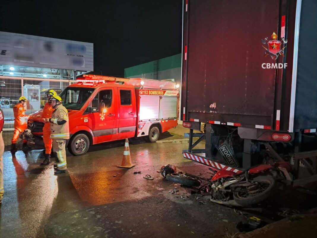 O Corpo de Bombeiros Militar do Distrito Federal (CBMDF) atendeu, na noite deste domingo (12), uma ocorrência de grave acidente envolvendo uma motocicleta e uma carreta na Área de Desenvolvimento Econômico (ADE) de Águas Claras, em frente à Taguamotors. O chamado foi registrado às 19h12.