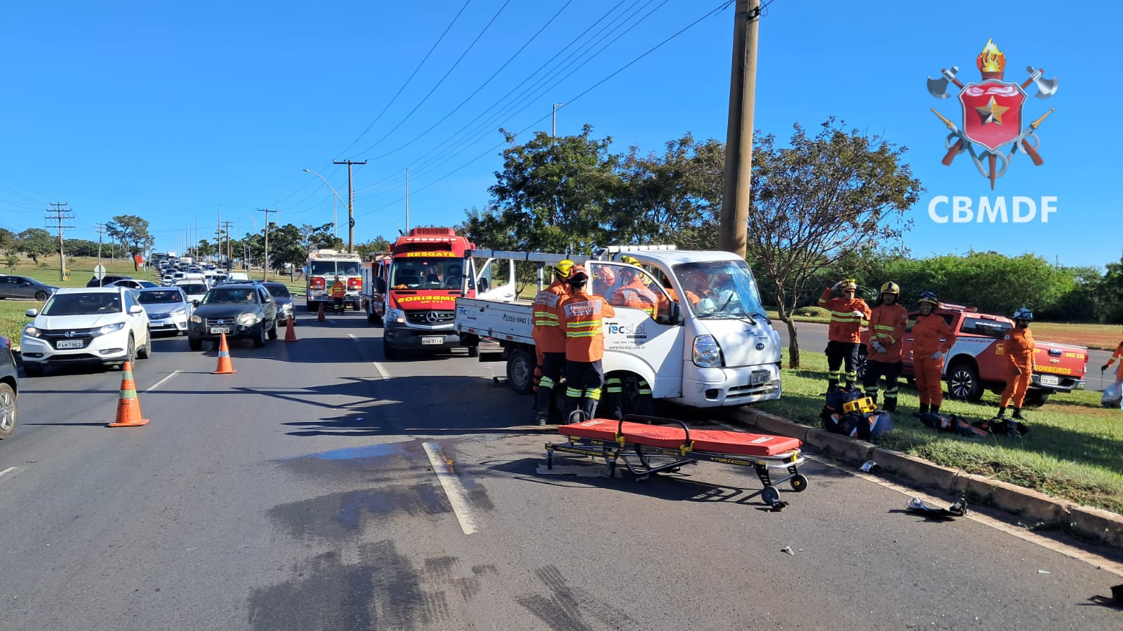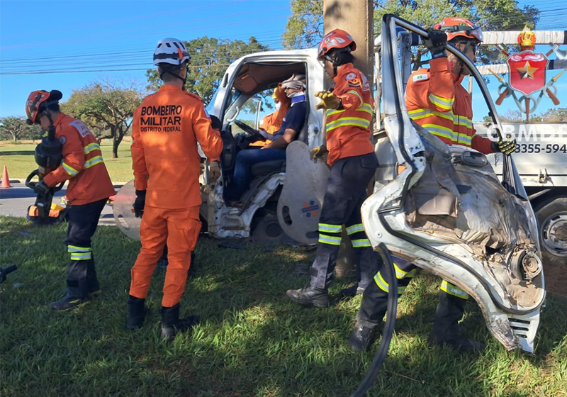 De acordo com o Corpo de Bombeiros Militar do Distrito Federal (CBMDF), a ocorrência foi registrada por volta das 8h20, e ao chegarem, os bombeiros encontraram um caminhão de pequeno porte, de cor branca, com a cabine destruída após o impacto. O condutor estava preso às ferragens, sendo necessário o uso de técnicas de salvamento para a retirada segura da vítima.