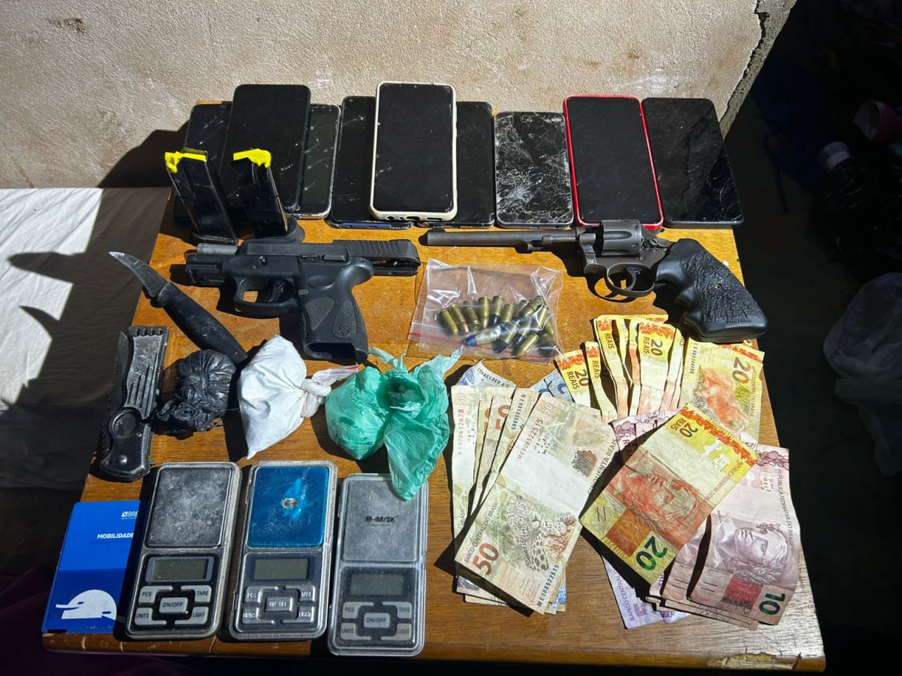 Na segunda ocorrência, também no Setor Santa Luzia, uma denúncia levou os policiais a uma residência onde foram encontradas duas armas de fogo (pistola 9mm e revólver calibre .32), munições, cocaína, balanças de precisão, dinheiro e celulares.